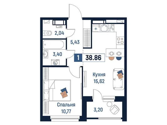1-комн. от 39,18 до 40,95 м² от 7,54 млн до 8,41 млн ₽