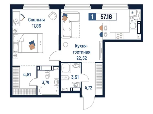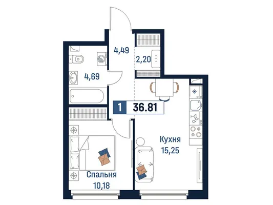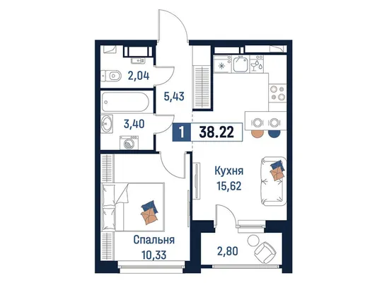 1-комн. от 37,16 до 38,9 м² от 7,25 млн до 8,05 млн ₽