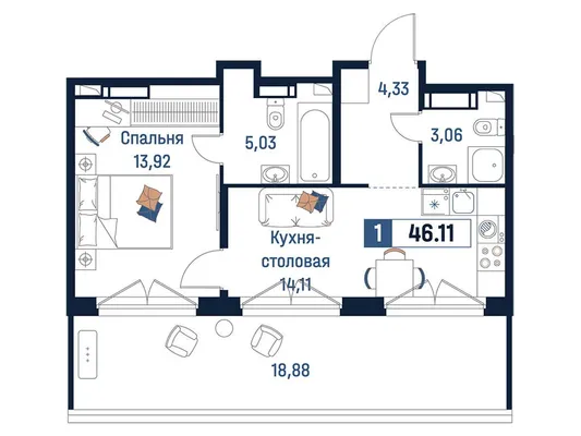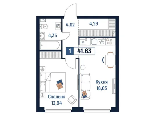 1-комн. от 41,11 до 42,97 м² от 7,70 млн до 9,24 млн ₽