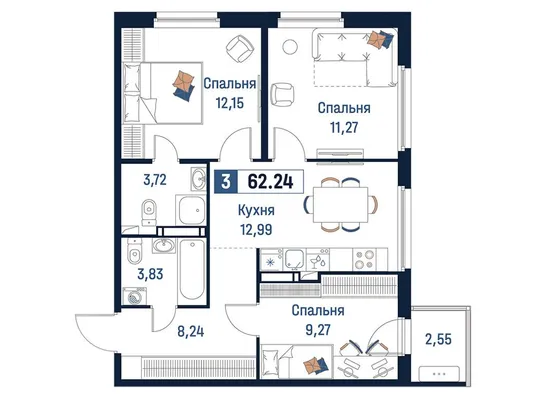 3-комн. 62,24 м²
