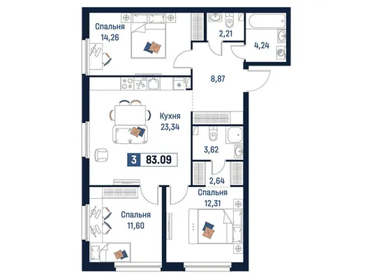 3-комн. от 83,09 до 84,04 м²