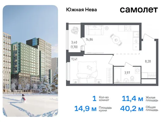 1-комн. от 39,1 до 40,8 м² от 6,68 млн до 8,04 млн ₽