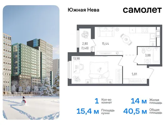1-комн. от 39,15 до 40,51 м² от 7,34 млн до 7,89 млн ₽