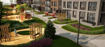 Архитектурная концепция выполнена в духе современной европейской застройки с акцентом на минимализм и выразительную геометрию. Фасады решены в спокойной натуральной палитре, где сочетаются теплые кирпичные оттенки, серые и графитовые акценты. Композиция построена на четком ритме оконных проемов и лаконичных объемах, формирующих единый визуальный образ квартала. Стиль можно охарактеризовать как современную урбанистическую архитектуру с продуманной функциональностью и сдержанным декоративным оформлением.