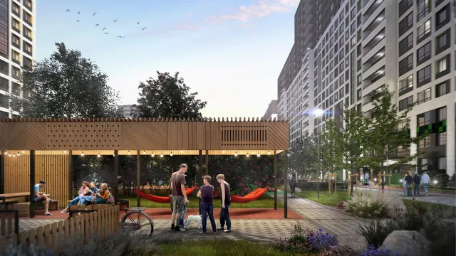 Проект благоустройства территории ЖК «Пулковский дом» включает создание закрытого двора, свободного от автомобилей, с озеленением, детскими игровыми площадками, спортивными зонами, местами отдыха, прогулочными дорожками и велосипедными парковками у парадных. Автомобили можно размещать на выделенной открытой парковке на 96 машино-мест, оснащенной станциями для зарядки электромобилей.