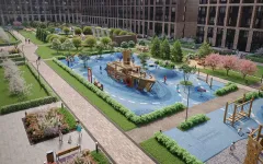 Придомовая территория продумана как единое рекреационное пространство. Здесь будут созданы два тематических парка — Активити Парк и Ривьера Парк. Активити Парк объединит спортивные и игровые площадки для разных возрастов, беговые дорожки, уличные тренажёры, площадки для командных видов спорта, зону панна-футбола и настольного тенниса, пространства для йоги и пилатеса. Ривьера Парк станет зоной спокойного отдыха с ландшафтным дизайном, арт-объектами, кинотеатром под открытым небом, панорамной ротондой, прогулочными аллеями и зелёными насаждениями. Вдоль набережной планируется устройство прогулочного променада. Вся территория комплекса будет закрытой и находиться под охраной.